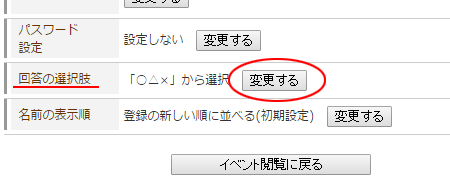 イベント編集ページの「回答の選択肢」という項目の「変更する」ボタンを押すことで、