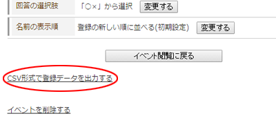 イベント編集ページで「CSV形式で登録データを出力する」をクリックすると、回答表のデータがCSV形式で出力されますので、それをEXCELに取り込むことが出来ます。