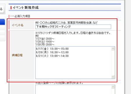 ![]() 入力が必須の項目は、「イベント名」と「候補日程」の2つのみです。「イベント名」には、他の人が見てわかりやすい名前をつけてください。「候補日程」には、スケジュールの調整をしたい日程を1行に1つずつ入力してください。 |
