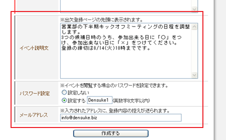 ![]() 「イベント説明文」に入力した内容は、出欠登録ページの先頭部分に表示されるので、イベントについての詳しい説明や、入力の際の注意事項などがあれば、ここに記載してください。 「パスワード設定」は、出欠登録ページにパスワードをかけたい時に入力します。 「メールアドレス」は、登録内容の控えを自分自身に送信したい場合に入力します。 |