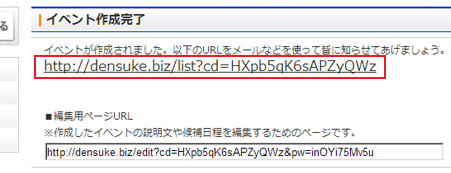 ![]() これでイベントの作成は完了しました。 表示されているURLが、作成されたページのアドレスになります。 スケジュールを調整したい人に、メールなどでこのアドレスをお知らせすれば、準備は完了です。 まずは、自分自身の出欠を登録しておきましょう。 →「出欠の登録のやりかた」 |