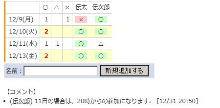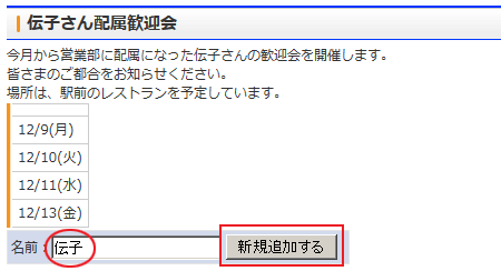 1) | イベントページの「名前」の欄に、お名前を入力して、「新規追加する」ボタンを押します。 |