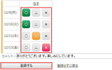 2) | 各日程の出欠を「◯×△」から選択し、「登録する」ボタンを押します。 |