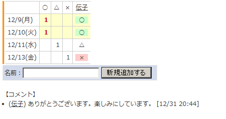 3) | 登録した出欠の内容が、イベントページに反映されます。 |