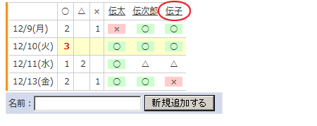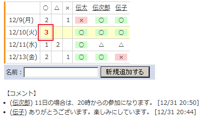![]() 他の方が登録した出欠も一覧表に表示されます。 候補日程の右に表示される数字は、日程ごとの「◯×△」の数です。 最も「◯」が多い行は、背景色が薄い黄色になります。 |