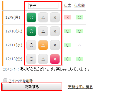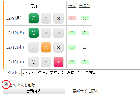 2) | 出欠を変更する画面に移動しますので、「◯×△」の選択肢を変更して「更新する」ボタンを押してください。 |